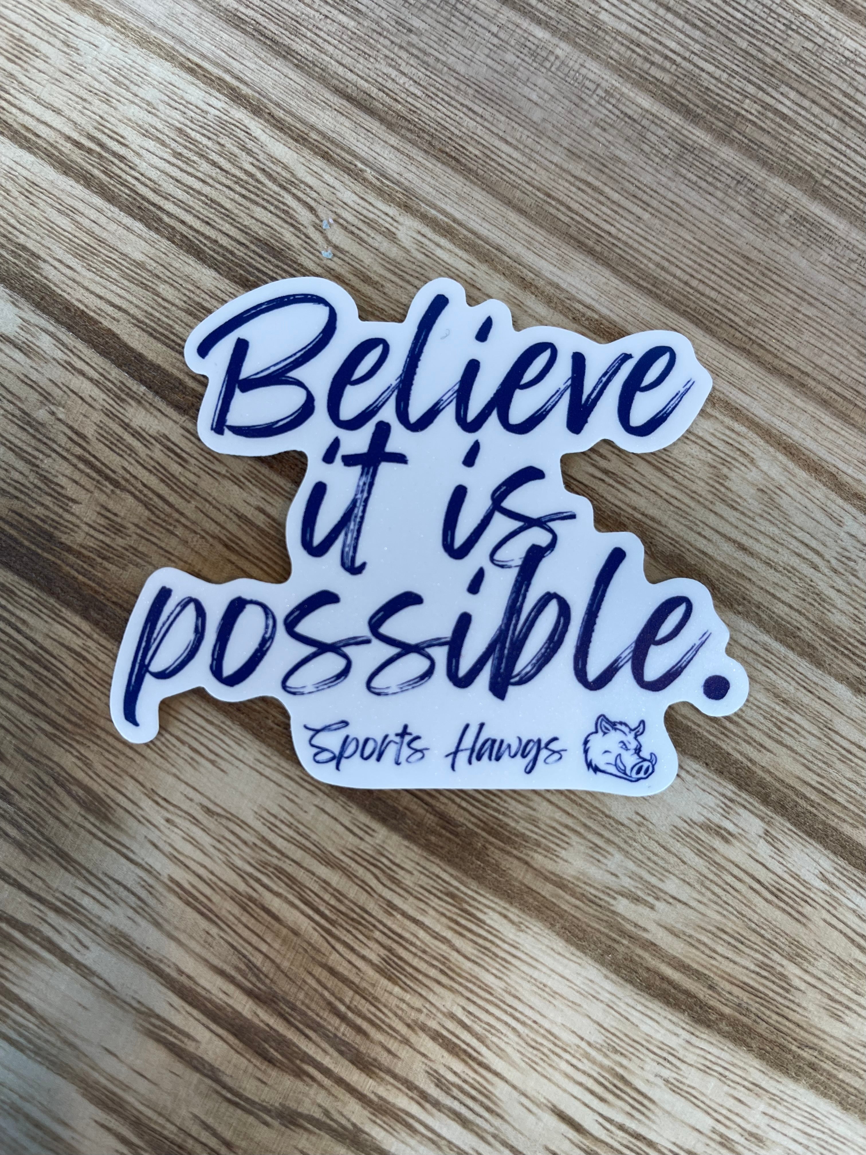 “Believe It Is Possible” is how Sports Hawgs live every day! Believe in yourself and work every day to meet your goals one step at a time. Remind yourself that it IS POSSIBLE with this new Vinyl Sticker. Perfect for laptops, notebooks, water bottles or wherever you want to give yourself a positive boost! Approximately 3”.