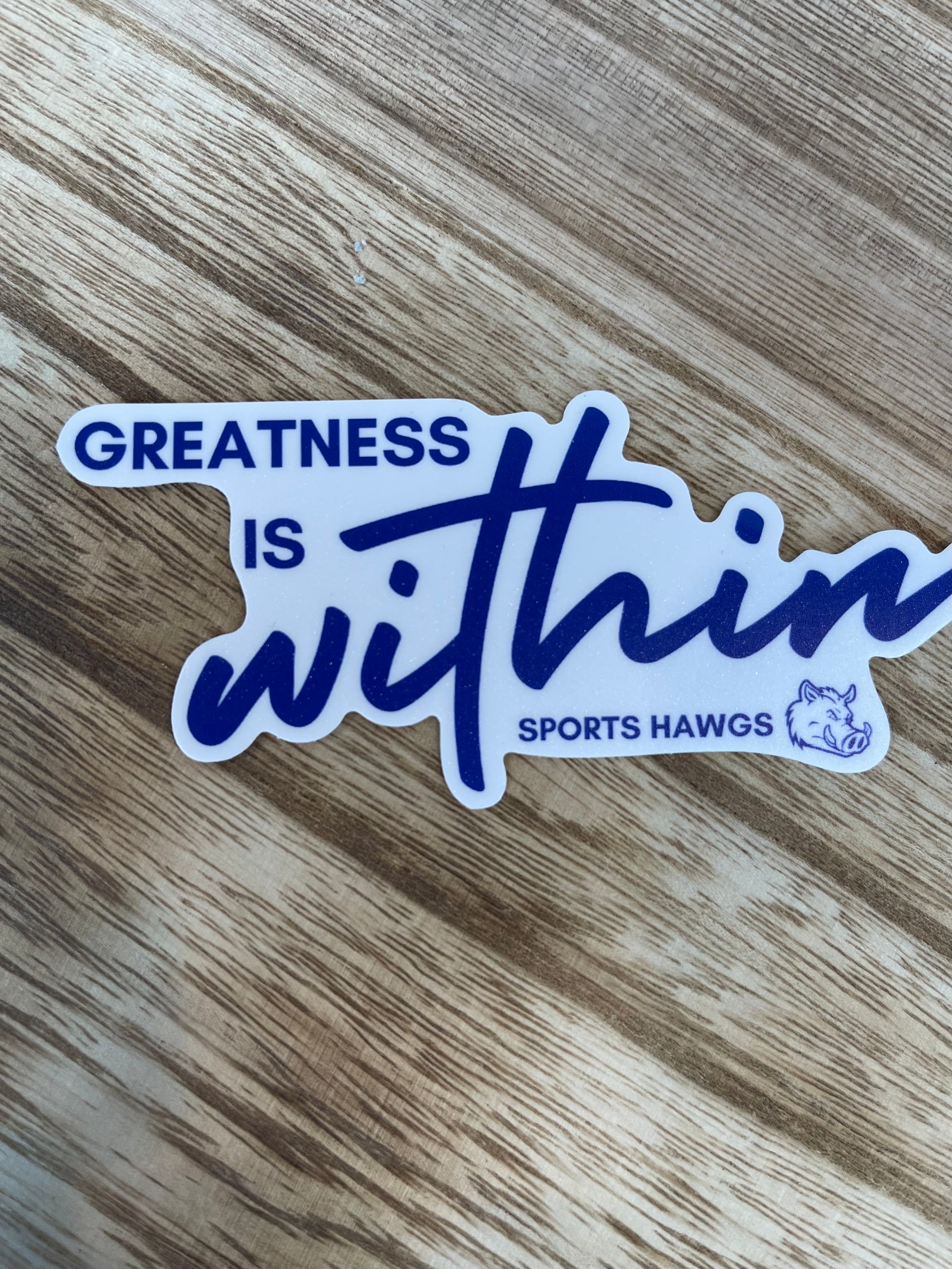 Sports Hawgs believes that “Greatness Is Within” each of us. Believe in yourself and work every day to be YOUR best. Remind yourself that GREATNESS is WITHIN you with this new Vinyl Sticker. Perfect for laptops, notebooks, water bottles or wherever you want to give yourself a positive boost! Approximately 3”.